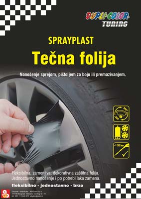 Molimo sačekajte...Sa novim proizvodom DUPLI COLOR SPRAYPLAST elastičnom folijom u laku dostupnom u 7 nijansi promenite površinski dizajn na vozilu ili u domaćinstvu brzo i jednostavno. Sve površine prekrivene Sprayplast-om mogu se prelakirati i kasnije odstraniti (oguliti).